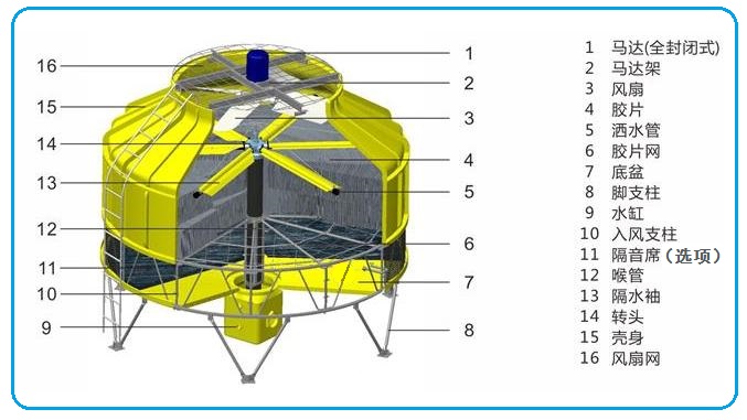 圓形逆流式玻璃鋼冷卻塔采用逆流式氣熱交換技術(shù),填料采用改性聚氯乙波片,以擴(kuò)散淋水面積;通過旋轉(zhuǎn)布水方式,實現(xiàn)布水均勻,增強(qiáng)冷卻效果。
